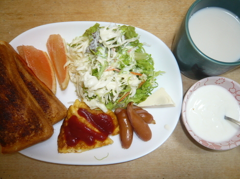 グレープフルーツ、サラダ、チーズ、ウインナー、スペインオムレツ、トースト、ヨーグルト、豆乳ティー