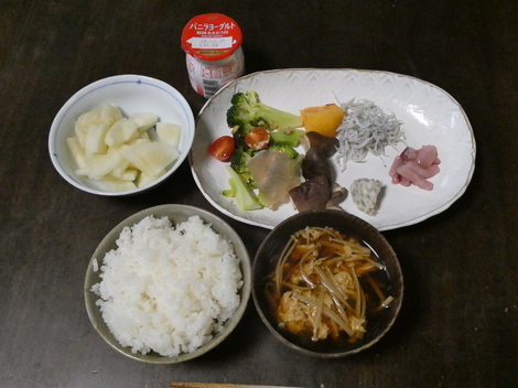 今朝は、ヤーコン、ヨーグルト、ブロッコリーと生ハムのサラダ、焼きシイタケ、柿、しらす干し、イカの塩辛、わさび漬け、エノキの卵とじ味噌汁、ごはんでした😋