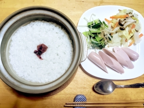 粥、お魚ソーセージ、茹で野菜