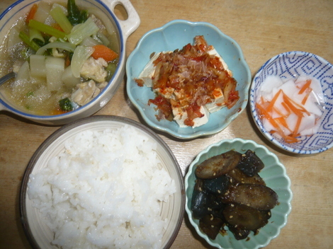 かぶ鶏肉ポトフ、かぶ人参酢の物、ごぼうこんにゃくの甘辛炒め、キムチおかか豆腐、ご飯