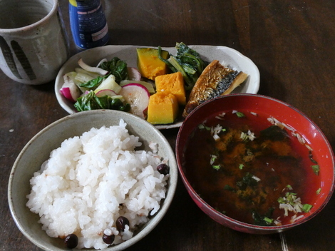 今日のお昼は、飲むヨーグルト、しゃくし菜とラディッシュの浅漬け、カボチャ、ほうれん草胡麻和え、サバの塩焼き、わかめの味噌汁(インスタント)、豆ごはんでした。