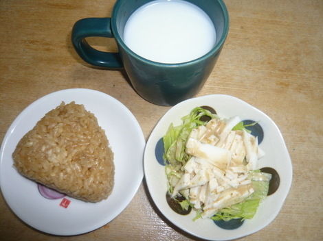 鶏めしおにぎり、山芋サラダ、ホットミルク