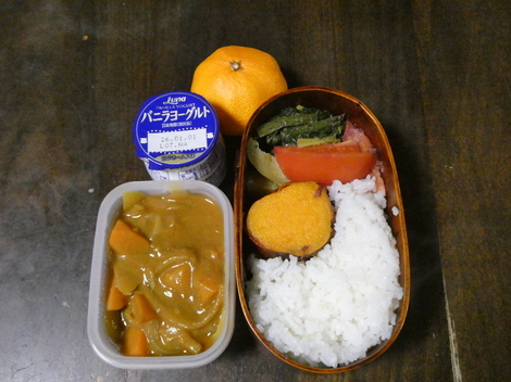 今日は、ほうれん草胡麻和え、サツマイモ、トマト、大根ハリハリ漬け、カレー、🍊ミカン、ヨーグルトです(^m^)/