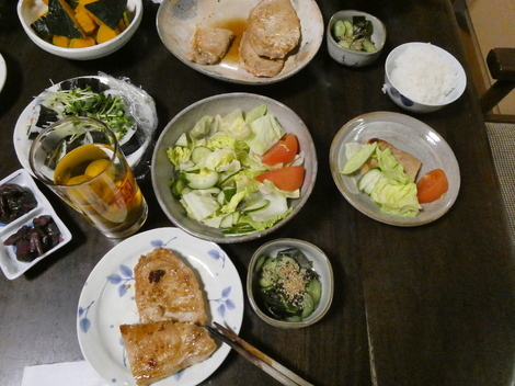今夜は、焼き肉、カボチャ、キュウリとわかめの酢の物、サラダなどで晩酌しました😋