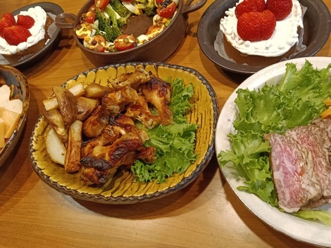 昨夜は子どもたちとクリスマスメニューを作りました(^^)タンドリーチキンとポテトに、市販ロールケーキに飾り付けるだけの簡単ケーキを❤️