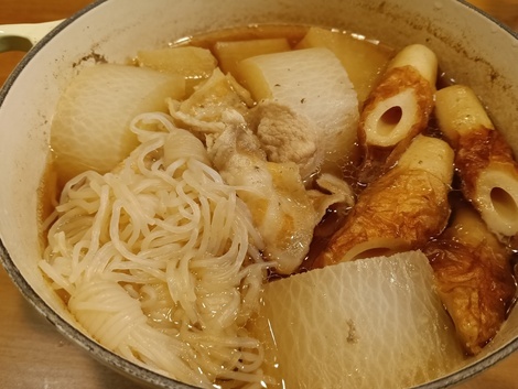実家から届いた大きな大根を消費したくて、おでんを仕込みました❤️豚バラとしらたき、竹輪いりで…(^^)