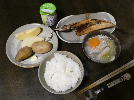 今朝は、ヨーグルト、リンゴ、わさび漬け、じゃが芋、サンマの開き、鍋の残りで朝ごはんを食べました😋