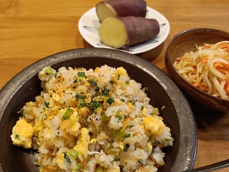 昨夜はたまってきていた冷凍ご飯で、炒飯にしました(^^)残り物の塩鮭をほぐしていれたので、冷蔵庫もスッキリ❤️