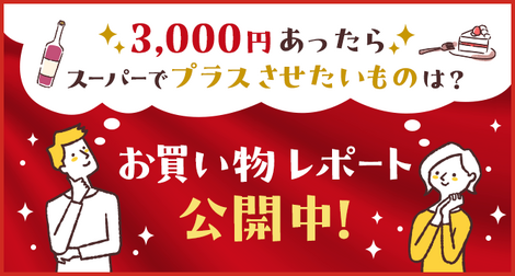 こちらのトピックは、レビュアーに当選されたみなさんに、いつものスーパーでのお買い物の際に3,000円プラスしてお買い物していただき、買ったものやお買い物した感想をレポートとしてご投稿いただくためのトピックです。