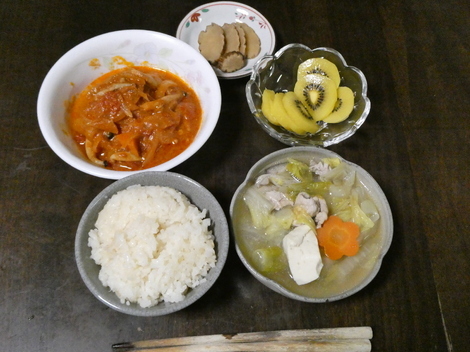 今朝は、いぶりガッコ、🥝キウイ、ハンバーグのトマトソース煮、昨夜の寄せ鍋をスープ代わりにして朝ごはんを食べました😋