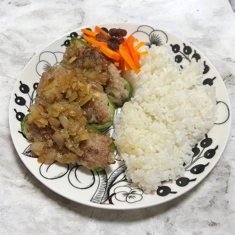 白米、ピーマン肉詰め、人参と干し葡萄の粒マスタードあえ