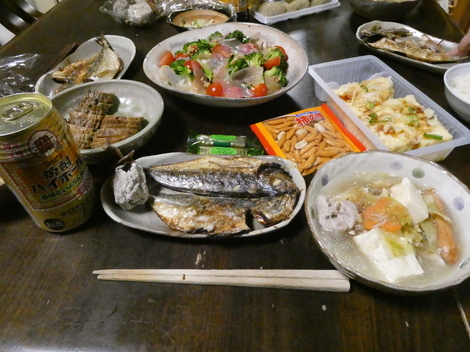 今夜の晩酌は、ブロッコリーと生ハムのサラダ、揚げ出し豆腐、柿の種、いぶりガッコ、アジの開き、寄せ鍋に春雨とウインナーを入れて味変などをつまみました😋