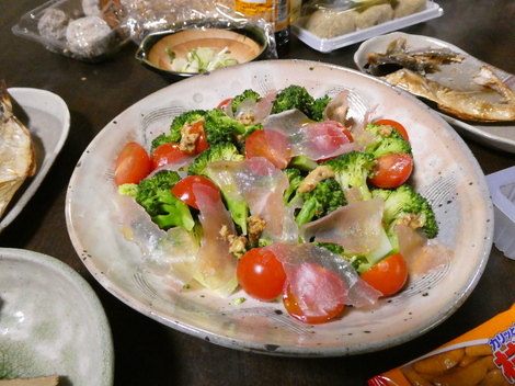 家庭菜園で採れた野菜でサラダを作りました。トマトは買いました。マヨネーズでいただきました。特に、ロマネスコが美味しかったです。