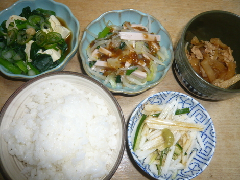 湯豆腐サラダ、胡瓜山芋のワサビ和え、モヤシソーセージのドレッシングかけ、豚肉大根の生姜炒め、ご飯