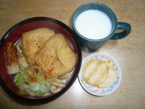 きつね竹輪そば、サラダせんべい、ホットミルク