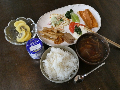今朝は、キウイ、ヨーグルト、ゴボウのフライ、いぶりガッコ、スパサラ、カプレーゼ(昨夜の残り)、青梗菜、乾燥芋、味噌汁で朝ごはんを食べました😋