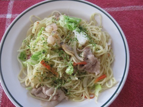 塩焼きそばにシーフードミックス(海老、イカ、アサリ)入れてます