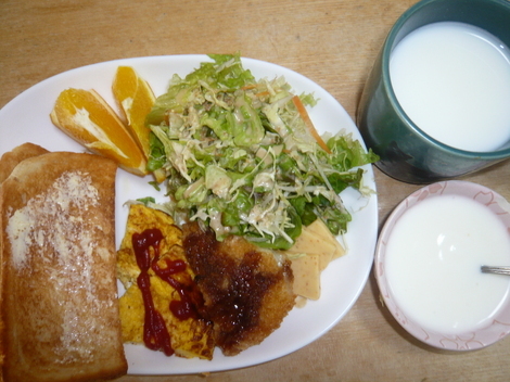 りんご、サラダ、一口チーズ、鶏キャベツオムレツ、チキンカツ、パン、ヨーグルト、豆乳ティ―