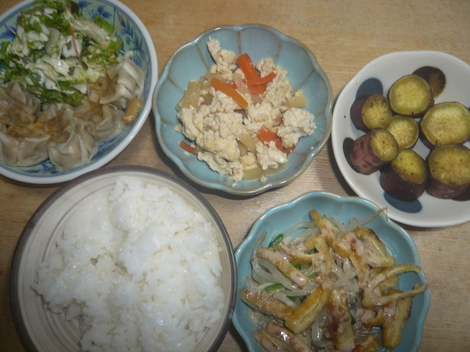 焼き油揚げもやし小松菜胡麻ドレ、焼売サラダ、炒り豆腐、さつま芋のバター醤油、ご飯