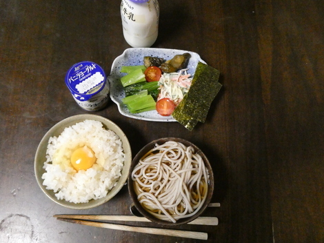 今朝は、牛乳、ヨーグルト、小松菜、ミニトマト、キュウリの漬物、スパサラ、味付けのり、お蕎麦、卵かけご飯でした😋