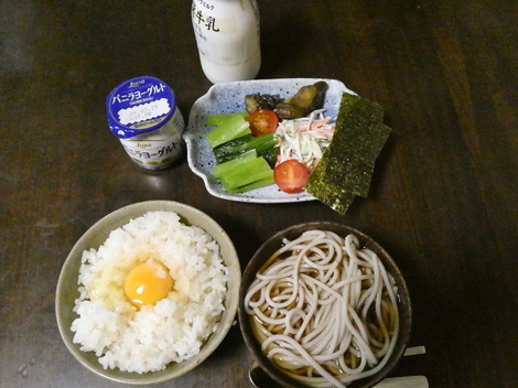 今朝は、牛乳、ヨーグルト、小松菜、ミニトマト、キュウリの漬物、スパサラ、味付けのり、お蕎麦、卵かけご飯を食べました😋