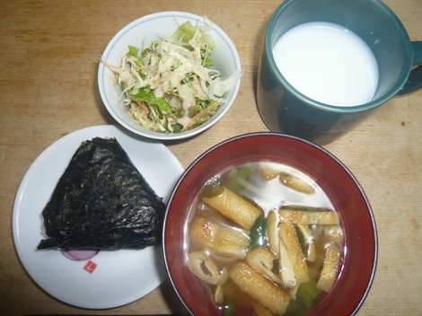 おかかおにぎり、サラダ、味噌汁、ホットミルク