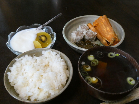 今朝は、キウイのヨーグルトかけ、シュウマイ、キュウリの漬物、乾燥芋、味噌汁で朝ごはんを食べました😋