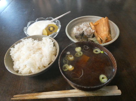 今朝は、キウイのヨーグルトかけ、シュウマイ、キュウリの漬物、乾燥芋、味噌汁で朝ごはんを食べました😋