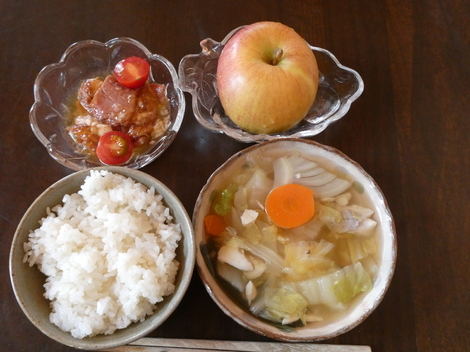今日のお昼は、牛の缶詰、野菜スープ、🍎リンゴでお昼ご飯を食べました😋