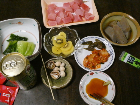 今夜は、マグロのブツ、青梗菜、キウイ、キュウリの漬物、、キムチ、コンニャク、銀杏とクルミなどで晩酌しました😋