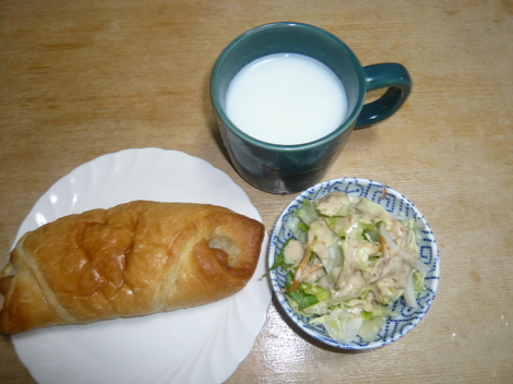 ソーセージクロワッサン、サラダ、ホットミルク