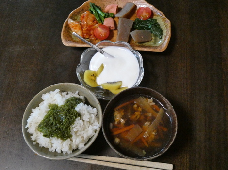 今朝は、キムチ、ミニトマト、小松菜、焼きたらこ、コンニャク、キウイのヨーグルトかけ、味噌汁、メカブかけご飯でした(^m^)/