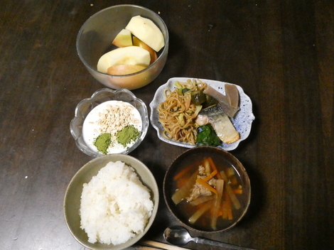 今朝は、🍎リンゴ、ヨーグルト(オートミールと抹茶入り)、昨夜残った焼きそば、キュウリの漬物、小松菜、サバの塩焼き、コンニャク、味噌汁で朝ごはんを食べました😋