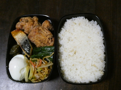 鶏唐揚げ(冷凍)、焼きサバ、小松菜、キュウリの漬物、焼きそば、ゆで玉子です😋