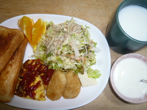 オレンジ、サラダ、チーズ、ツナマヨコロッケ、オムレツ、トースト、ヨーグルト、ミルク
