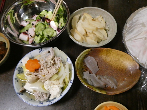 今夜は、キュウリとタコの酢の物、たくあん、刺身コンニャク、寄せ鍋などで晩酌しました😋