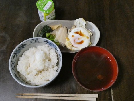 今朝は、ヨーグルト、ほうれん草、大根の甘酢漬け、目玉焼き、味噌汁で朝ごはんを食べました😋