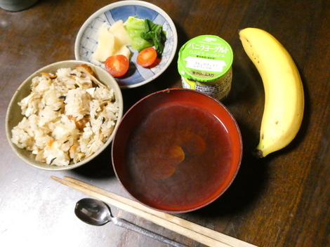 今朝は、たくあん、ミニトマト、青梗菜、ヨーグルト、バナナ、しじみの味噌汁で五目ごはんを食べました😋