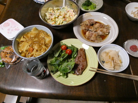 今夜は、マカロニサラダ、エノキの肉巻き、聖護院大根甘酢漬け、牛肉、カレーうどん、焼酎お湯割りなどでした😋