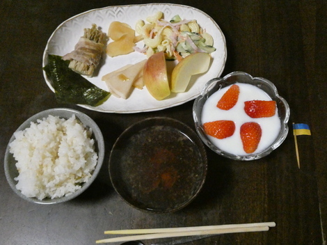今朝は、味付けのり、エノキの肉巻き、たくあん、聖護院大根甘酢漬け、マカロニサラダ、🍎リンゴ、イチゴ入りのヨーグルト、しじみの味噌汁で朝ごはんを食べました😋