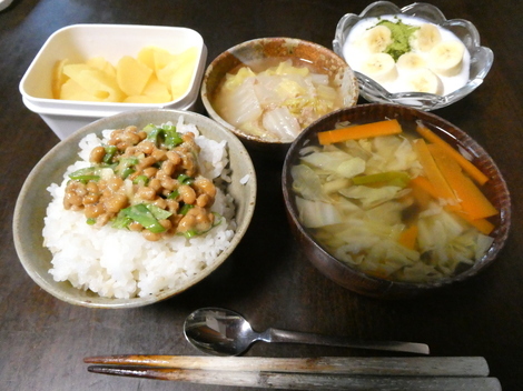 今朝は、たくあん、白菜とツナのクタクタ煮、バナナと抹茶を入れたヨーグルト、野菜スープ、納豆かけご飯を食べました👍