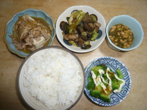 肉豆腐、めかぶ納豆、茄子キャベツ生姜炒め、ボイルドブロッコリー、ご飯