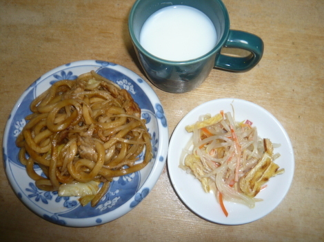 焼うどん、モヤシ油揚げの胡麻だれ、ミルク