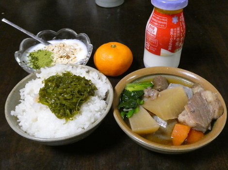 今朝は、オートミールと抹茶を入れたヨーグルト、🍊ミカン、牛乳、牛筋煮込み、メカブ乗せご飯でした😋