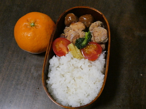今日は、ミートボール、鶏唐揚げ(冷凍)、ほうれん草、ミニトマト、たくあん、スナップエンドウ(唐揚げの下)、です(^m^)/