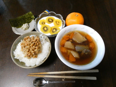 今朝は、味付けのり、わさび漬け、キウイを入れたヨーグルト、🍊ミカン、牛筋煮込み、納豆かけご飯です😋