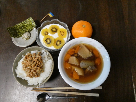 今朝は、味付けのり、わさび漬け、キウイを入れたヨーグルト、🍊ミカン、牛筋煮込み、納豆かけご飯を食べました😋