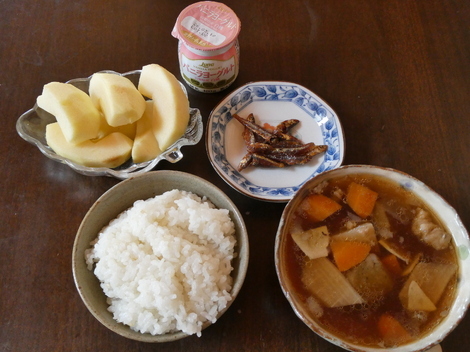 今日のお昼は、🍎リンゴ、ヨーグルト、ワカサギのつくだ煮、牛筋煮込みでお昼ご飯を食べました(^m^)/