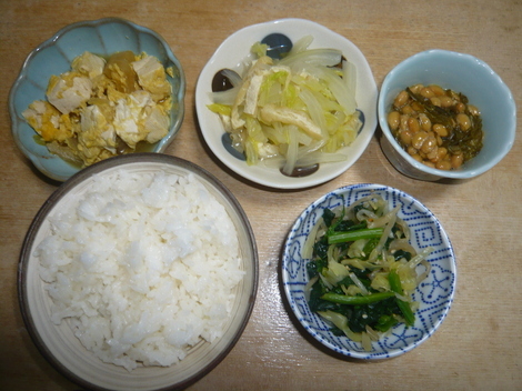 豆腐白菜の卵とじ、ほうれん草もやしナムル、めかぶ納豆、白菜油揚げ煮浸し