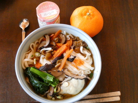今日のお昼は、ヨーグルト、🍊ミカン、うどんを食べました😋